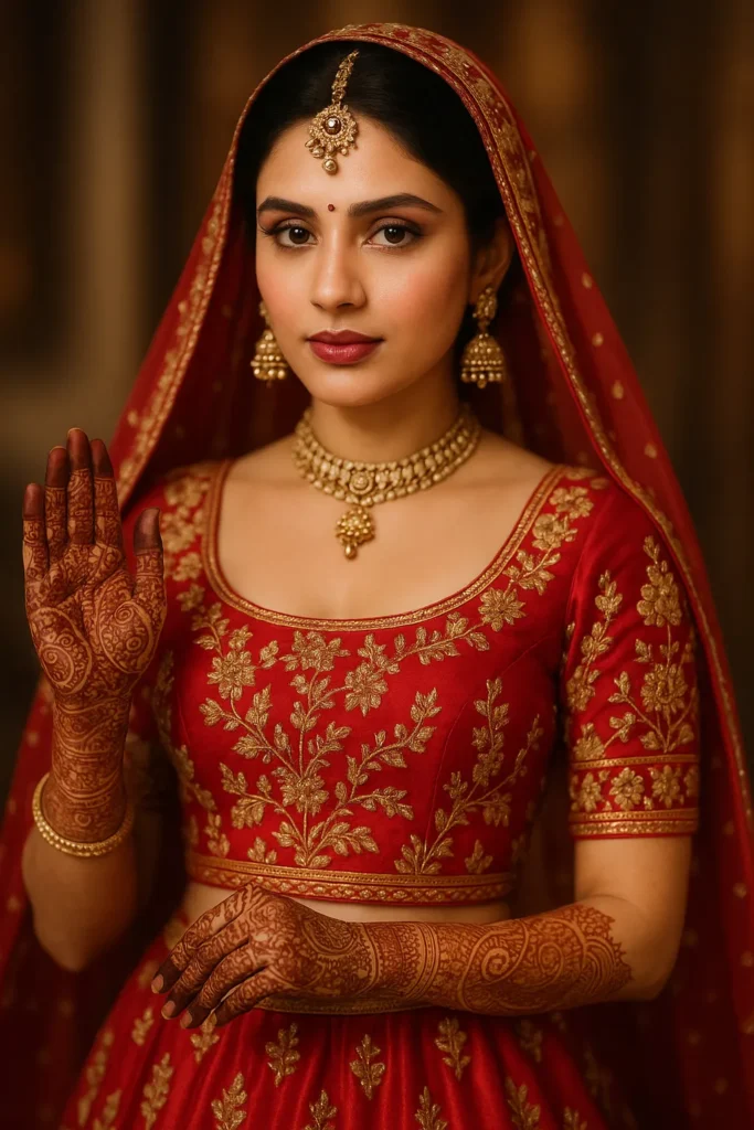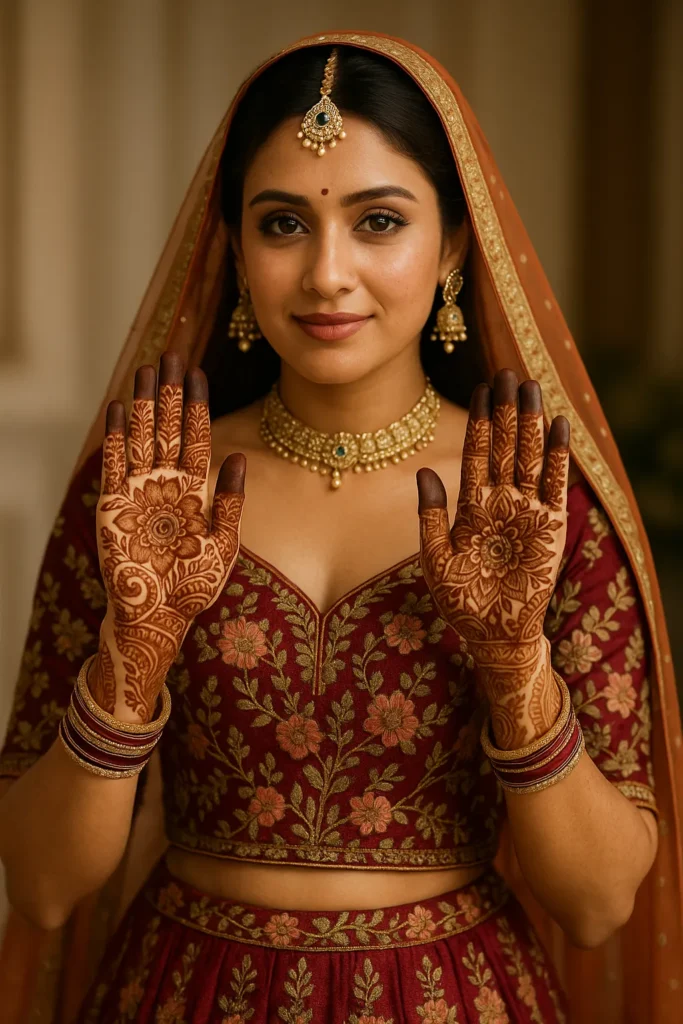 The girl’s outfit adds to the charm — a deep maroon lehenga choli richly embroidered with gold motifs that mirror the mehndi design’s floral patterns. Her fuller chest is modestly covered with a well-fitted blouse, keeping it elegant and AdSense-friendly while flattering her graceful posture. Paired with a soft net dupatta and traditional jewelry (like a maang tikka, choker, and jhumkas), the overall look radiates bridal beauty.
