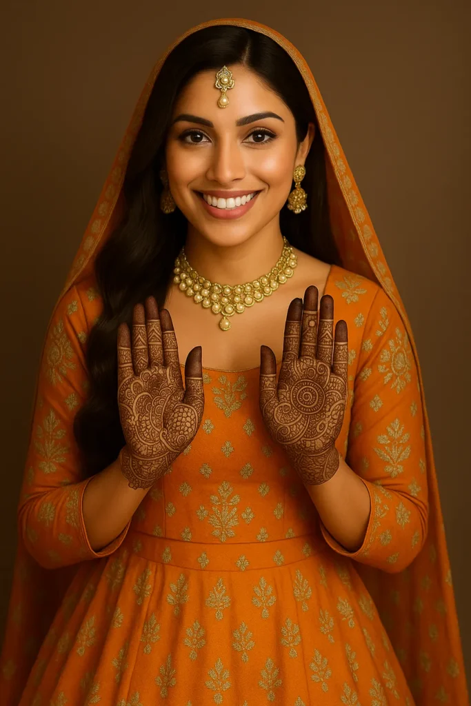 🍊 Dressed in Elegance – A Coral Ensemble Enhanced by Mehndi Magic