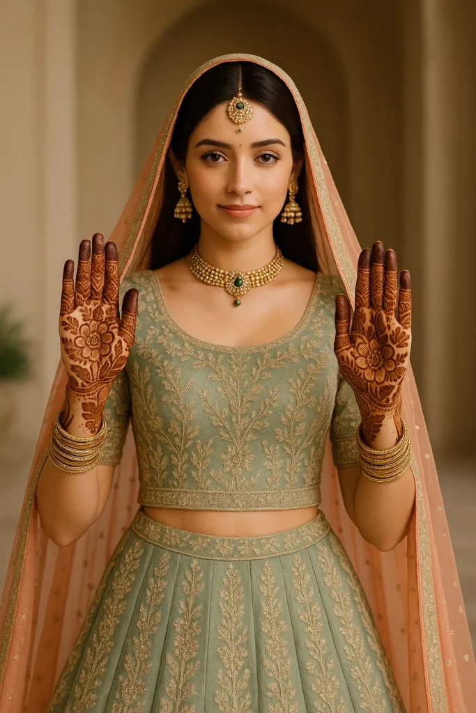 💚 Stunning Bride in Green Lehenga with Elegant Mehndi Design – A Perfect Blend of Beauty & Tradition